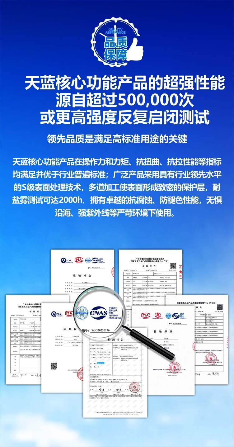 天蓝以精工品质及领先的功能五金应用技术服务于广大客户,致力于为建设工程项目创造可观的附加价值。天蓝旗下系列产品按照国际先进技术研发制造,