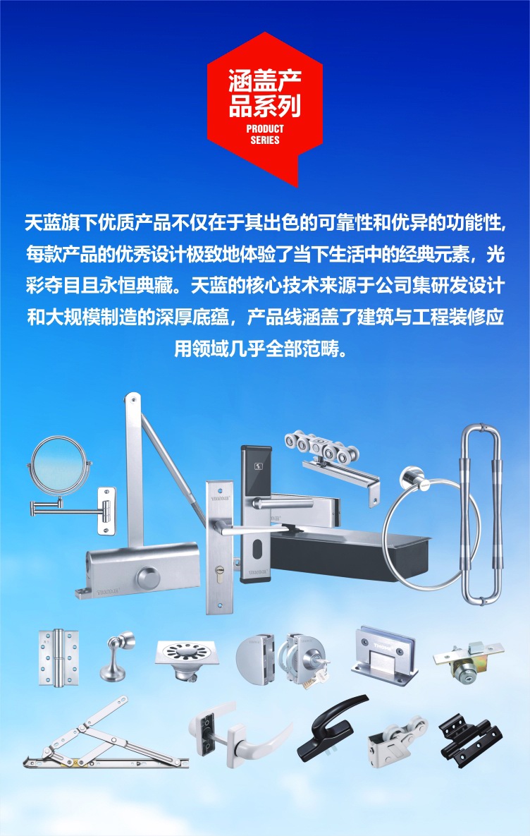 天蓝以精工品质及领先的功能五金应用技术服务于广大客户,致力于为建设工程项目创造可观的附加价值。天蓝旗下系列产品按照国际先进技术研发制造,